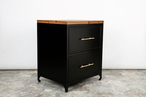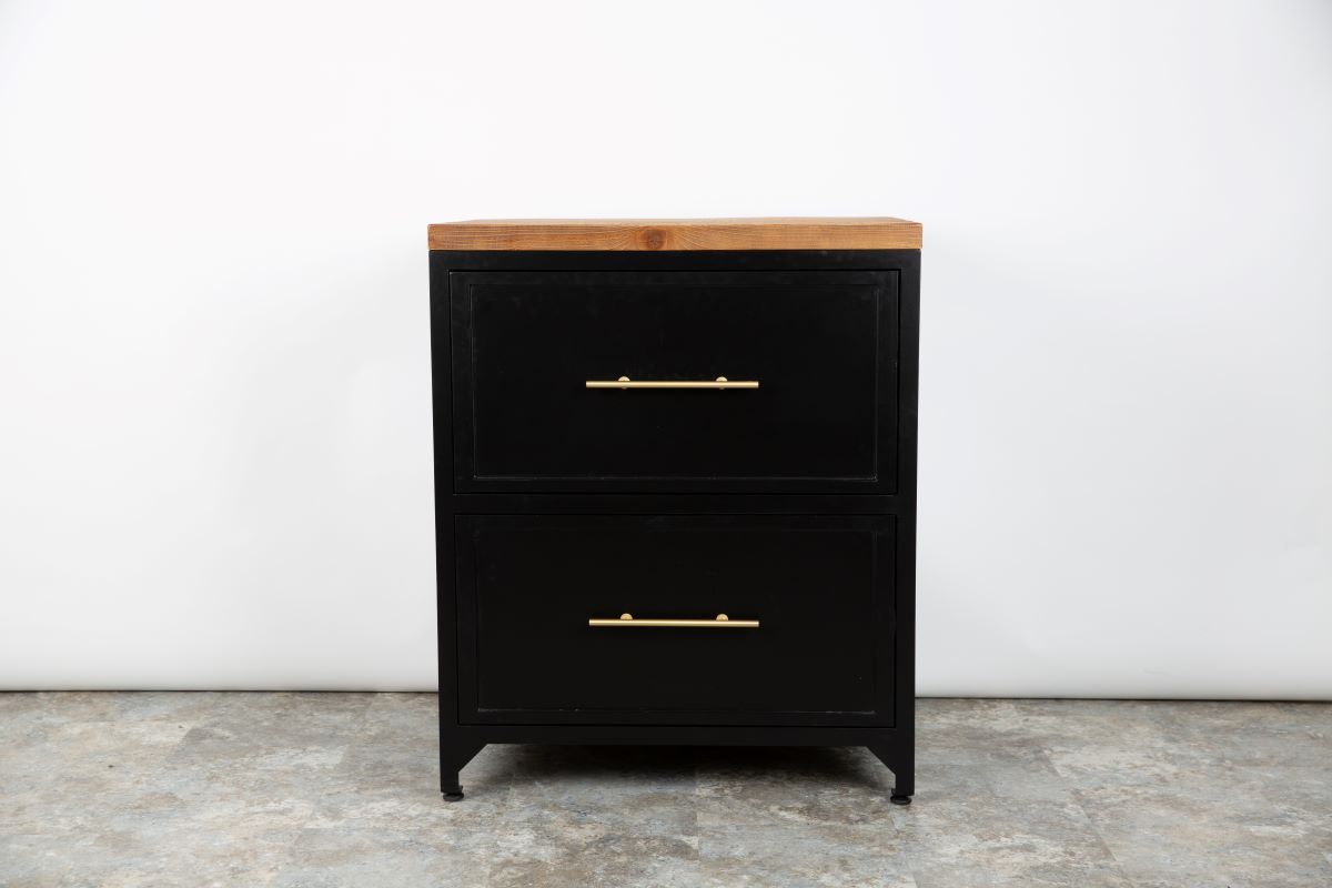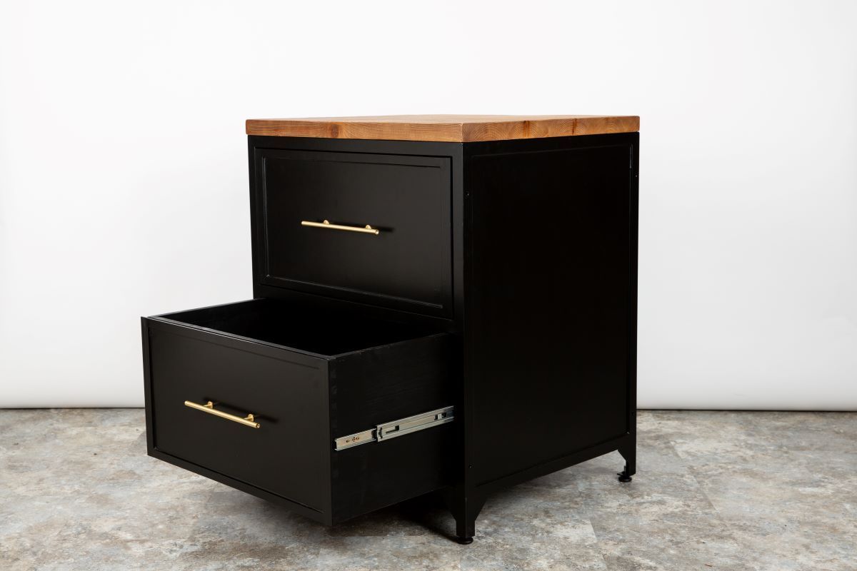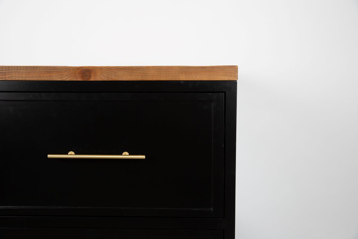 The Black 2-Drawer Base Cabinet is made of hand-forged iron. This multifunctional unit features a hidden drawer for maximum storage. This unique unit can stand alone, or pair with other units to create a custom kitchen unique to your space. With plenty of storage space, the three-drawer storage cabinet exudes modern style with its sleek black iron and contrasting brass pulls.