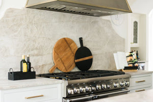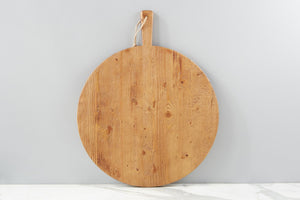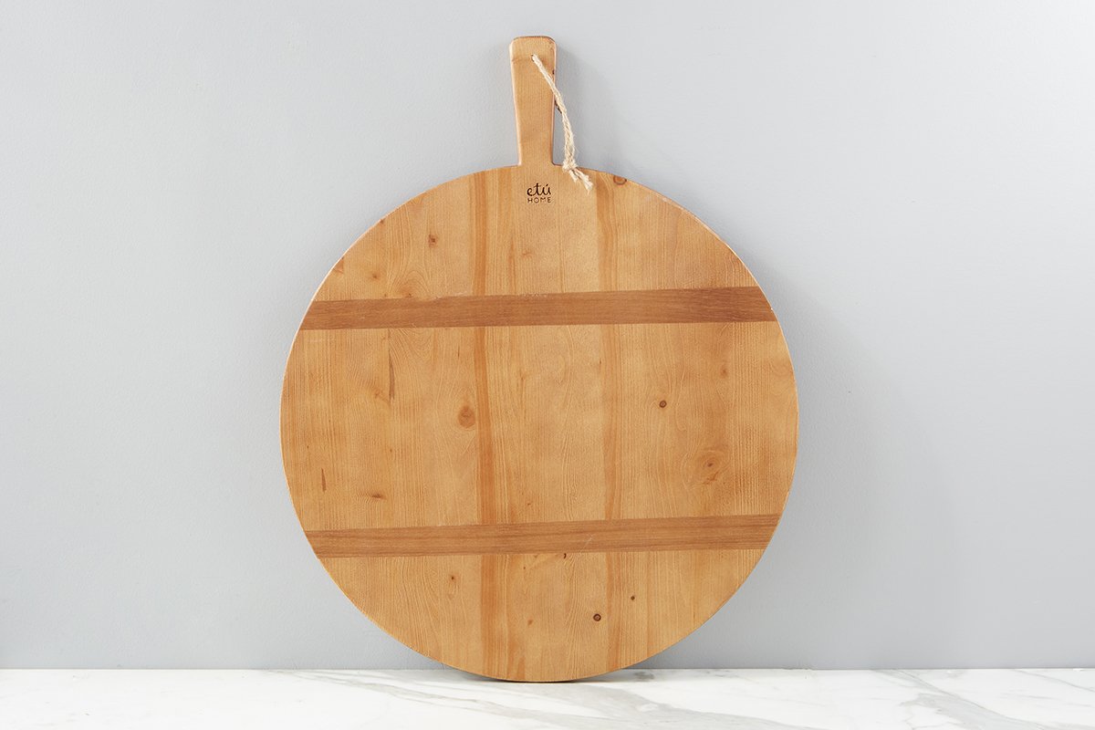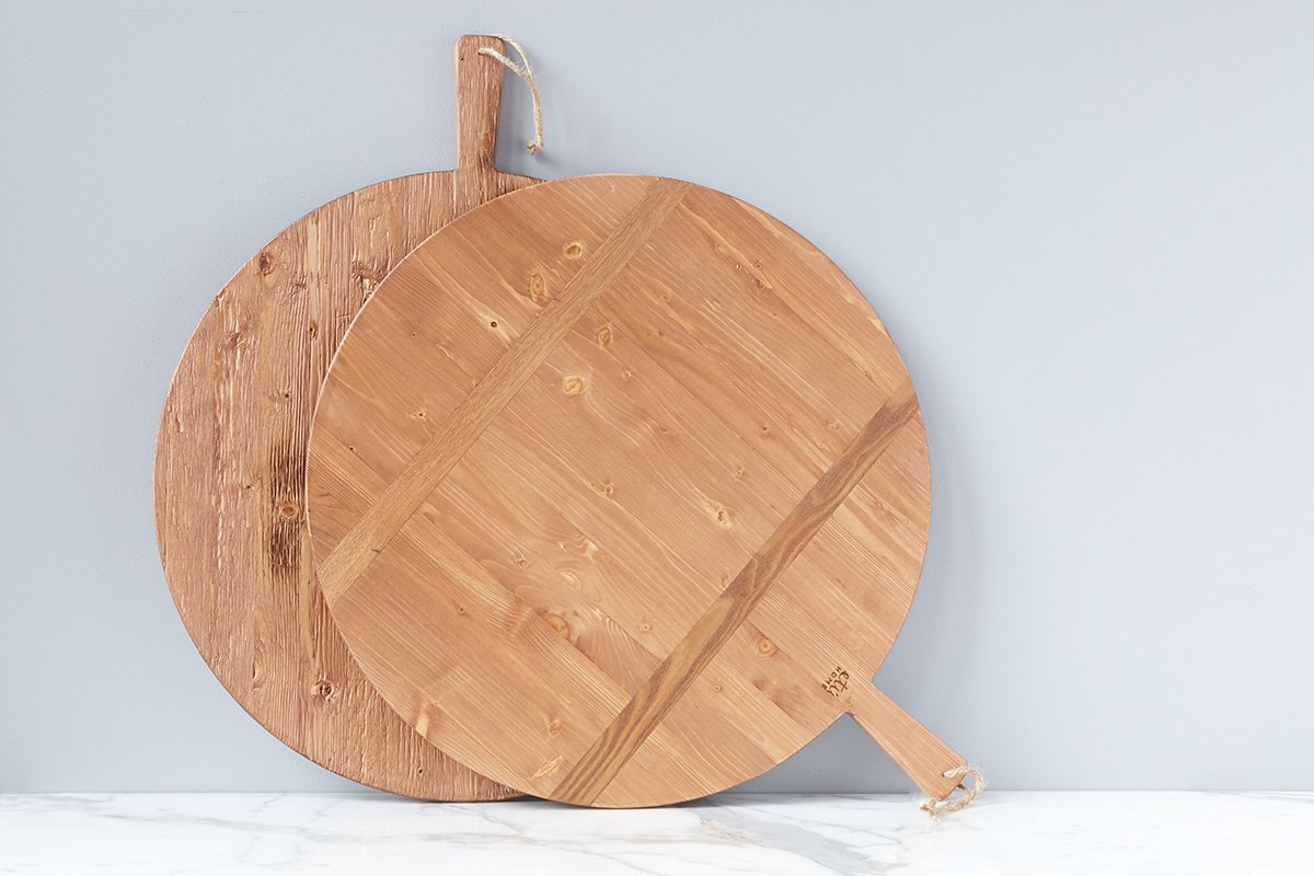 The inspiration behind these signature pizza boards derived from an original Italian design. These reclaimed wood boards are distinguished by two strips of contrasting timber on one side, while the other side of the board shows the authentic beauty of the reclaimed wood. Ideal for showcasing bread, cheese, or fruit at casual gatherings, the large wooden pizza board is even better for serving your own homemade pizza.